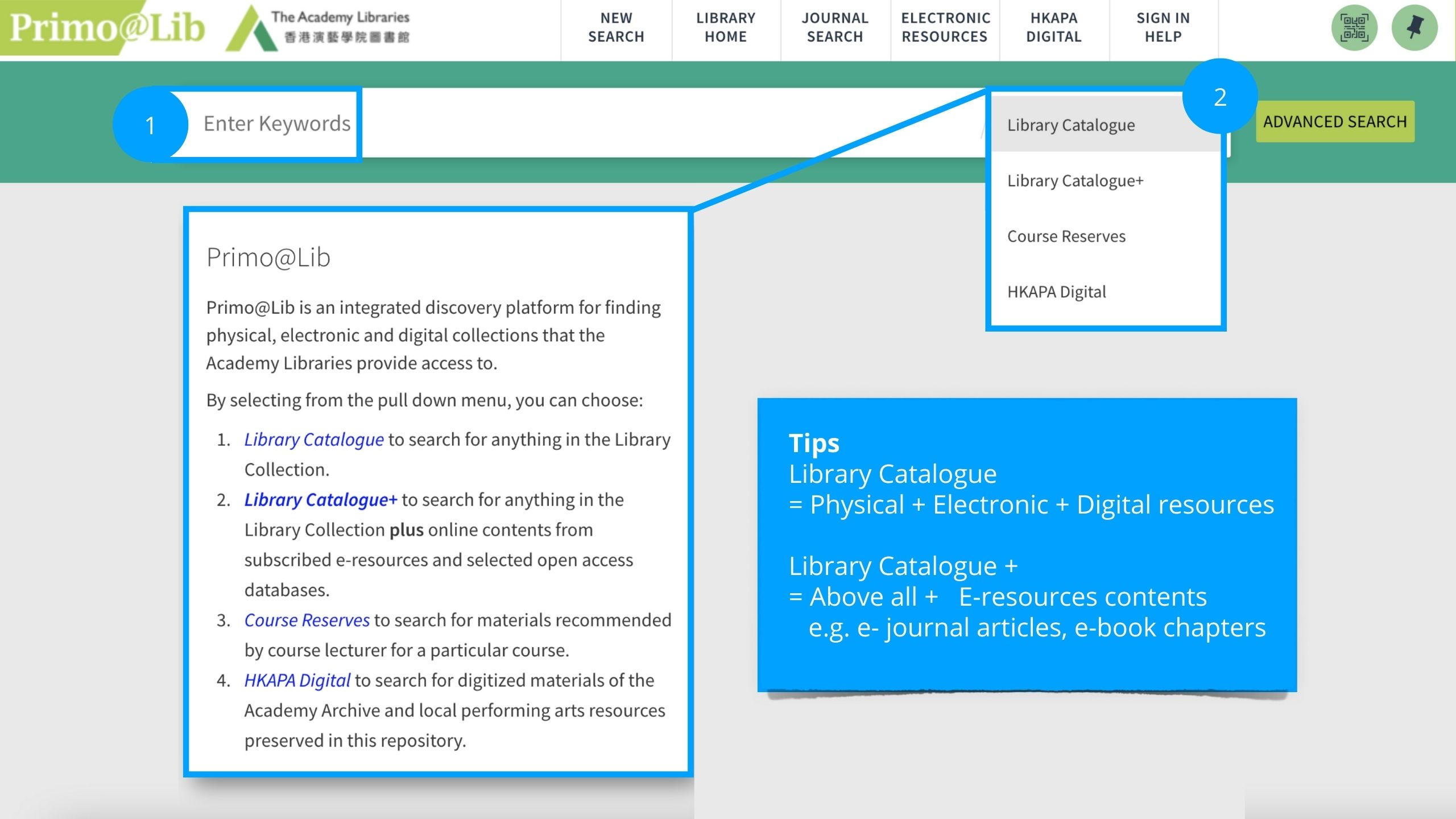 Library Catalogue+ (圖書館目錄+) to search for anything in the Library Collection plus online contents from subscribed e-databases on journal articles, multimedia resources, etc.