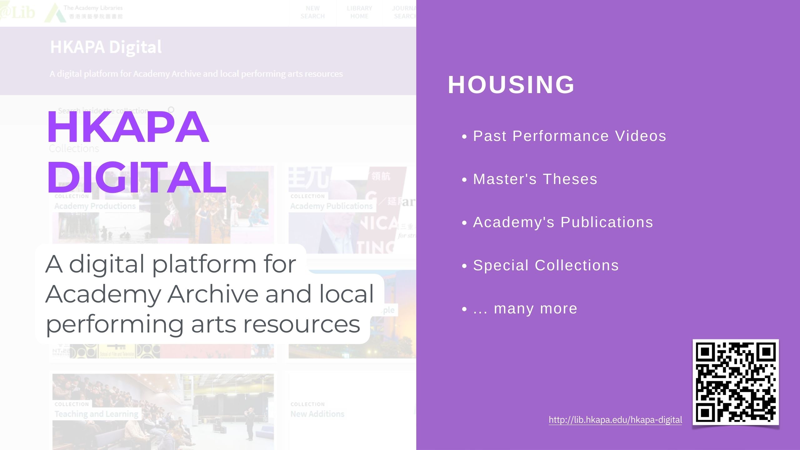 HKAPA Digital, a digital repository developed by the Library, consists of different types of materials produced by the Academy and the Academy community.
